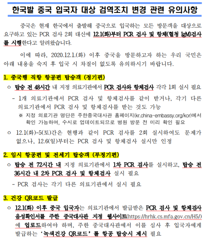 ㅇ 12.1(화) 이후 중국 입국자는 의료기관에서 발급받은 PCR 검사 및 항체검사 음성확인서를 주한 중국대사관 지정 웹사이트(https://hrhk.cs.mfa.gov.cn/H5/)에 업로드하여야 하며, 주한 중국대사관에서 이를 심사 후 입국자에게 발급하는‘녹색건강 QR코드’를 항공 탑승시 제시 필요