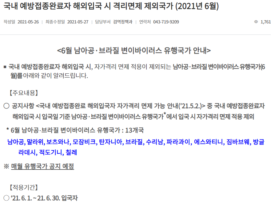 ■ 국내 예방접종완료자 해외입국 시, 자가격리 면제 적용이 제외되는 남아공·브라질 변이바이러스 유행국가(6월)를 아래와 같이 알려드립니다.
