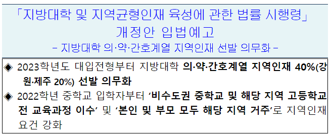 ㅇ 2022학년도 중학교 입학자부터는 지방대학 의·약·간호계열 지역인재 요건이 기존 ‘해당 지역의 고등학교 졸업자’에서 ‘비수도권 중학교 및 해당 지역 고등학교 전 교육과정을 이수하고 졸업한 자’, ‘본인 및 부모 모두가 해당 지역에 거주한 자’ 등 해당 요건을 모두 충족한 경우로 강화한다.