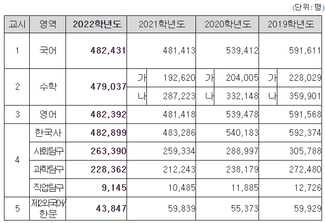 ◦ 영역별 지원자는 국어 영역 482,431명, 수학 영역 479,037명, 영어 영역 482,392명, 한국사 영역 482,899명, 사회탐구 영역 263,390명, 과학탐구 영역 228,362명, 직업탐구 영역 9,145명이며, 제2외국어/한문 영역은 43,847명이다.