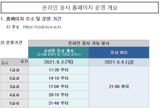 ◦ 코로나19 확산 방지를 위하여 시험장별 방역 대책이나 자가격리 등으로 인해 시험장 입실이 불가능한 응시 희망자 또는 시험 당일 발열 등으로 응시하지 못한 수험생을 위하여 작년 모의평가와 같이 온라인 응시가 가능하도록 홈페이지를 운영한다.