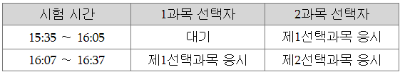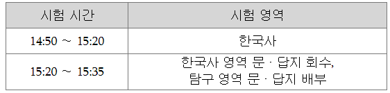 - 한국사와 탐구 영역 답안지 분리에 따라, 한국사 영역 시험 시간 종료 후 한국사 영역 문제지 및 답안지 회수 및 탐구 영역 문제지 및 답안지 배부 시간을 15분 부여한다(탐구 영역 미선택자는 대기실로 이동 가능).