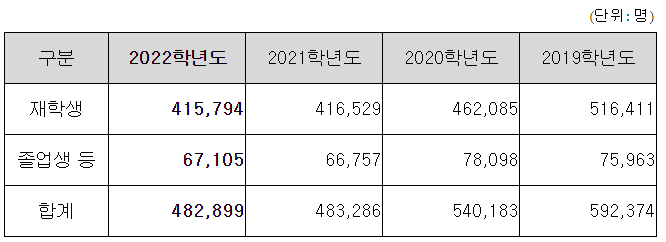 ◦ 이번 6월 모의평가에 지원한 수험생은 482,899명으로, 재학생은 415,794명이고 졸업생 등 수험생은 67,105명이다.