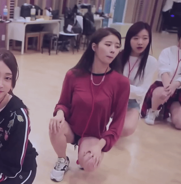 안무 연습 중 일어서는 러블리즈 미주, 빨간 티셔츠...