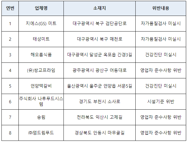 주요 위반내용은 ▲영업자 준수사항 위반(3곳)* ▲자가품질검사 미실시(2곳) ▲건강진단 미실시(2곳) ▲시설기준 위반(1곳)이며,