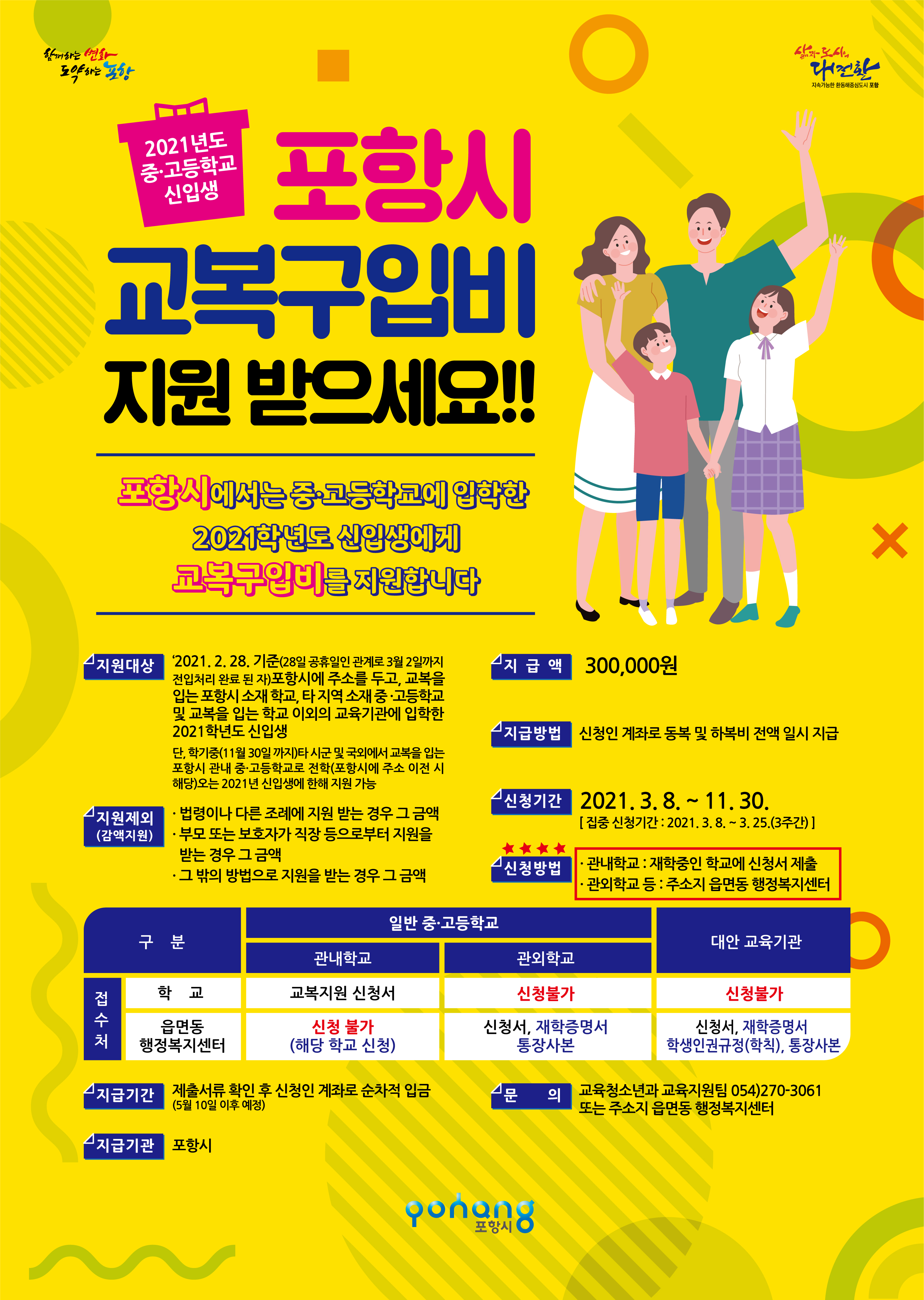 2021년 2월 28일 기준(3월 2일까지 전입처리 완료자) 포항시에 주소를 두고, 교복을 입는 포항시 소재 학교, 그리고 타 지역 소재 중,고등학교 및 교복을 입는 학교 이외의 교육기간에 입학한 2021학년도 신입생 에 한하여 1년 30만원 교복구입비를 지원해 준다.