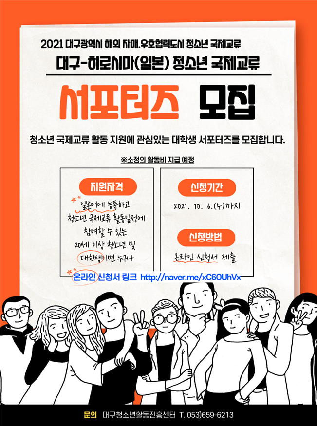 2021년 해외자매‧우호협력도시 청소년 국제교류 ‘대구-히로시마(일본)’ 교류활동의 원활하고 효과적인 운영을 위하여 교류활동 통역 등 참가자 지원활동을 함께할 청소년 국제교류 서포터즈단 모집