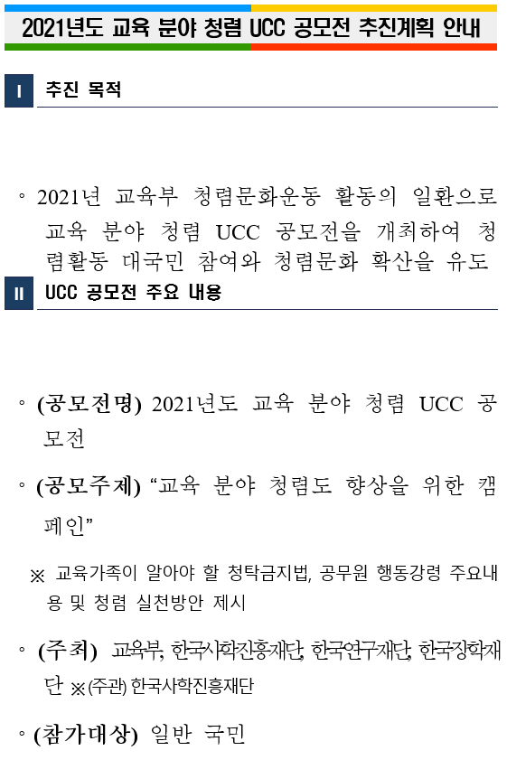 ◦ (공모전명) 2021년도 교육 분야 청렴 UCC 공모전