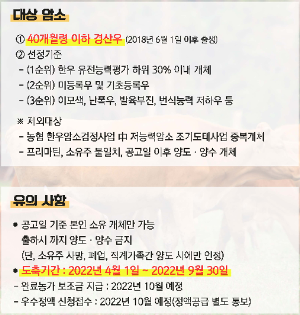 다. 지원대상 : 신청 공고일('21.10.1.) 현재 40개월령 이하 경산우를 6~12개월 비육하여 출하·도축을 희망하는 농가
