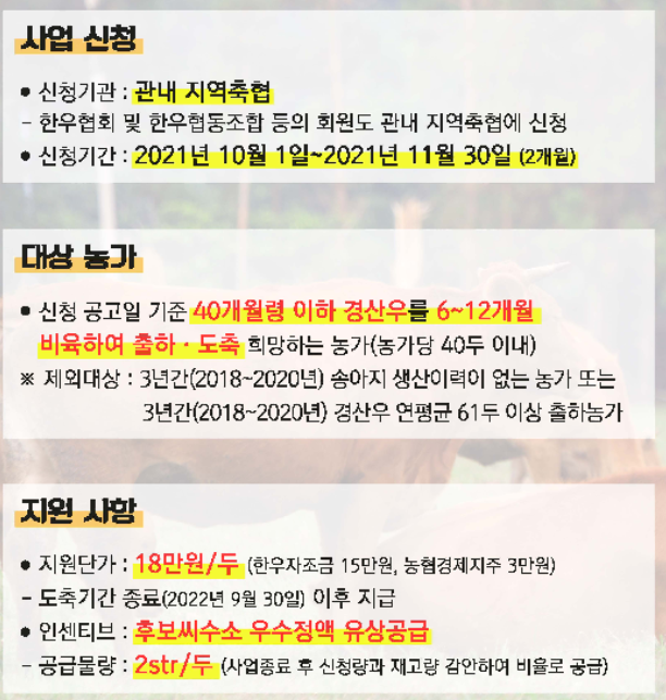 * '18~'20년 3년 동안 송아지 생산이력이 없는 농가 또는 경산우를 연평균 61마리 이상 출하한 농가는 지원대상 제외