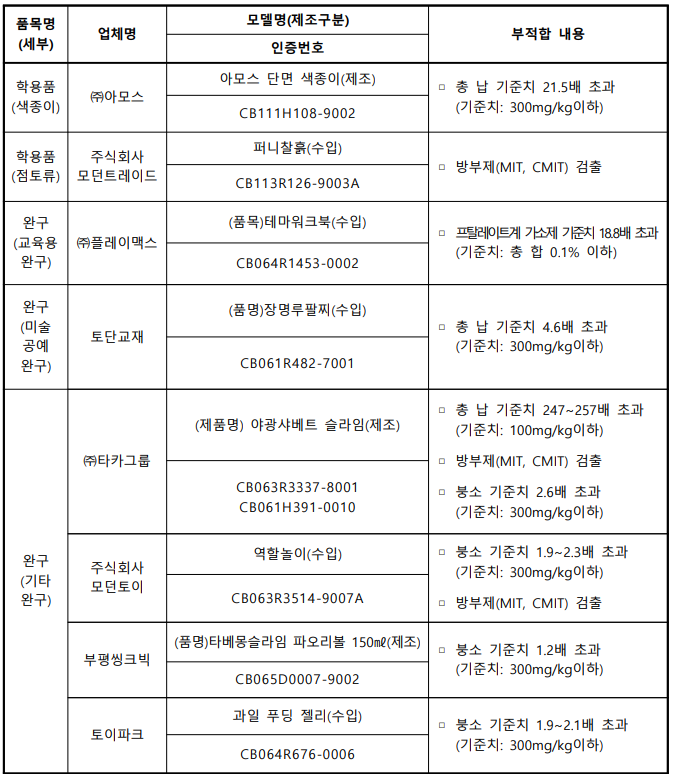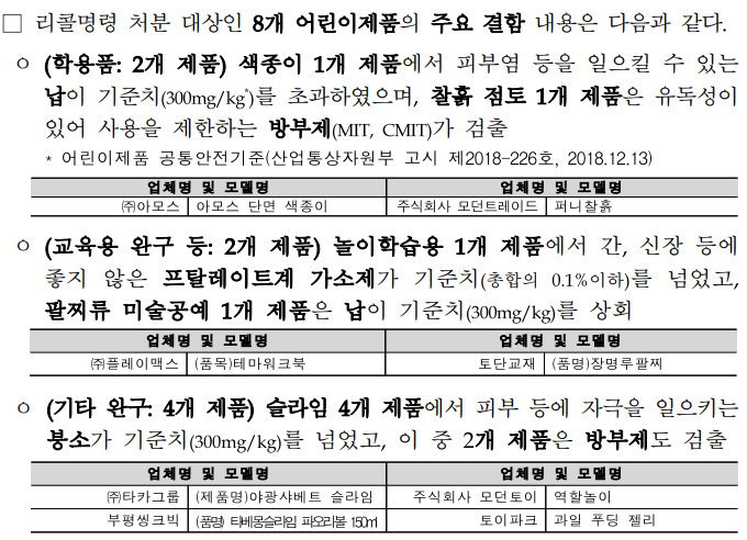 □ 리콜명령 처분 대상인 8개 어린이제품의 주요 결함 내용은 다음과 같다. ㅇ (학용품: 2개 제품) 색종이 1개 제품에서 피부염 등을 일으킬 수 있는 납이 기준치(300mg/kg*)를 초과하였으며, 찰흙 점토 1개 제품은 유독성이 있어 사용을 제한하는 방부제(MIT, CMIT)가 검출 * 어린이제품 공통안전기준(산업통상자원부 고시 제2018-226호, 2018.12.13