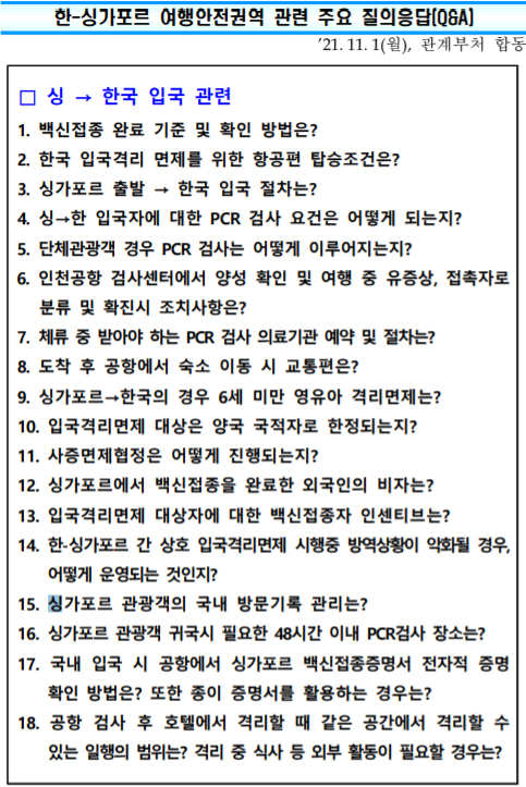 ※ (백신 미접종자) 싱→한 방향 직항편에 탑승 가능하나, 입국 후 격리대상 - 단, 만6세 미만 영유아(도착일 기준)로서 백신접종완료 보호자와 동반시 격리면제 ㅇ 운항증편 또는 지방공항發 노선개설 등은 향후 검토 예정임