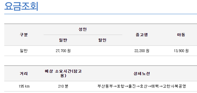 한마디로 포항에서는 태백까지만 가는 표만 판매하고 고한사북공영터미널까지는 판매하지 않는? 좀 이상한 구조이다.
