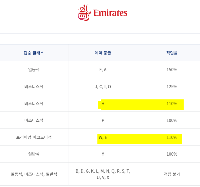 에미레이트 항공사의 H등급 비즈니스석은 110% 로 10% 추가 적립이 되며,