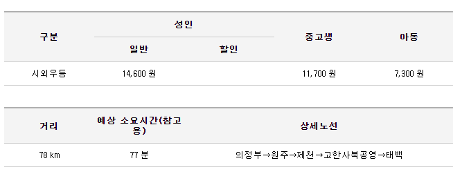 의정부 -> 원주 -> 제천 -> 고한사북공영 -> 태백 까지 간다.