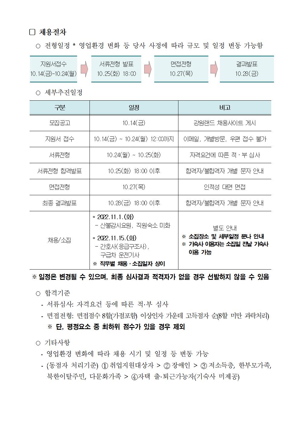 모집분야는 산불감시요원 7명(하이원리조트), 간호사/응급구조사(하이원리조트), 구급차 운전기사(하이원리조트), 직원숙소 미화(고한 내 직원숙소) 이다.