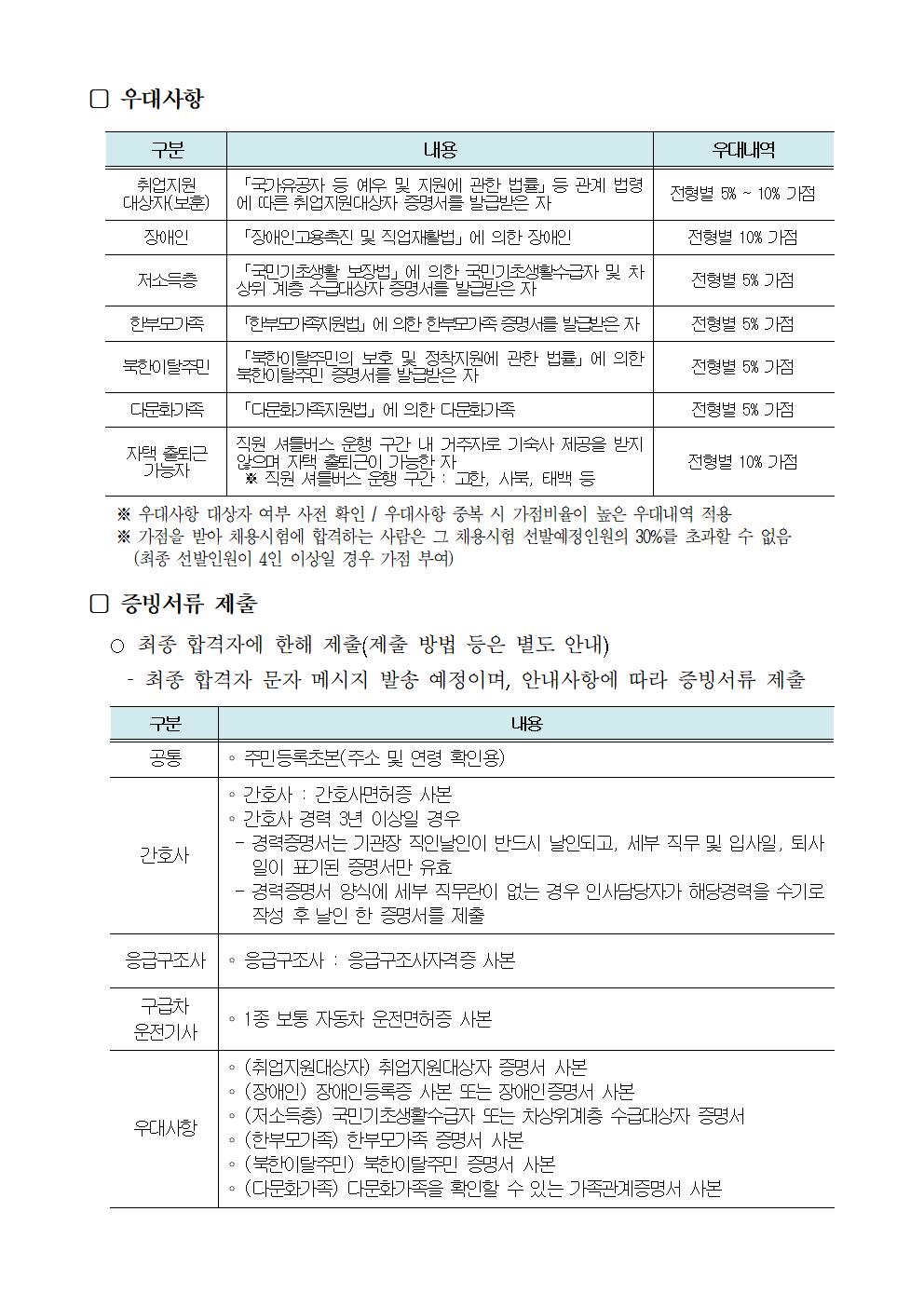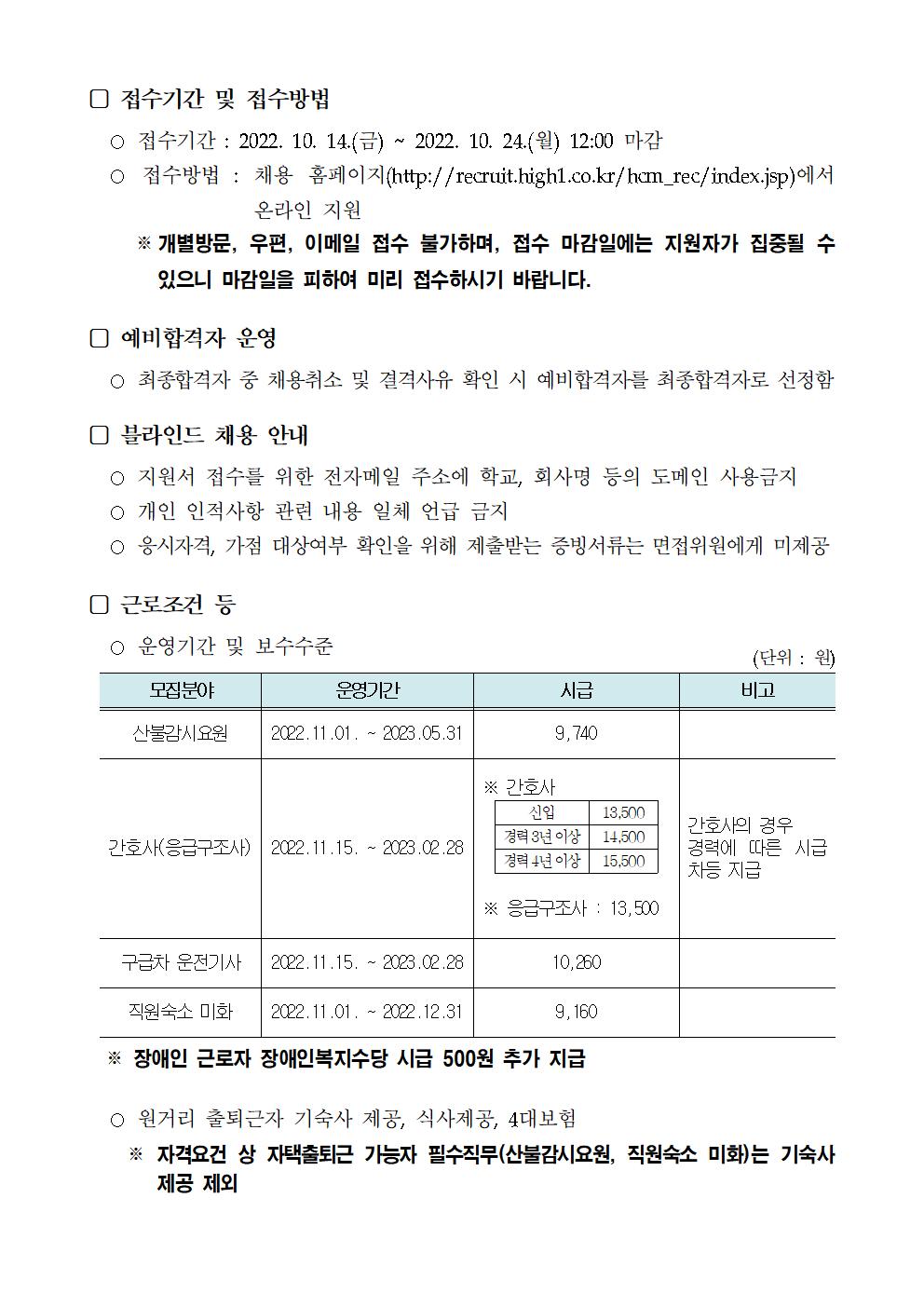 모집분야는 산불감시요원 7명(하이원리조트), 간호사/응급구조사(하이원리조트), 구급차 운전기사(하이원리조트), 직원숙소 미화(고한 내 직원숙소) 이다.