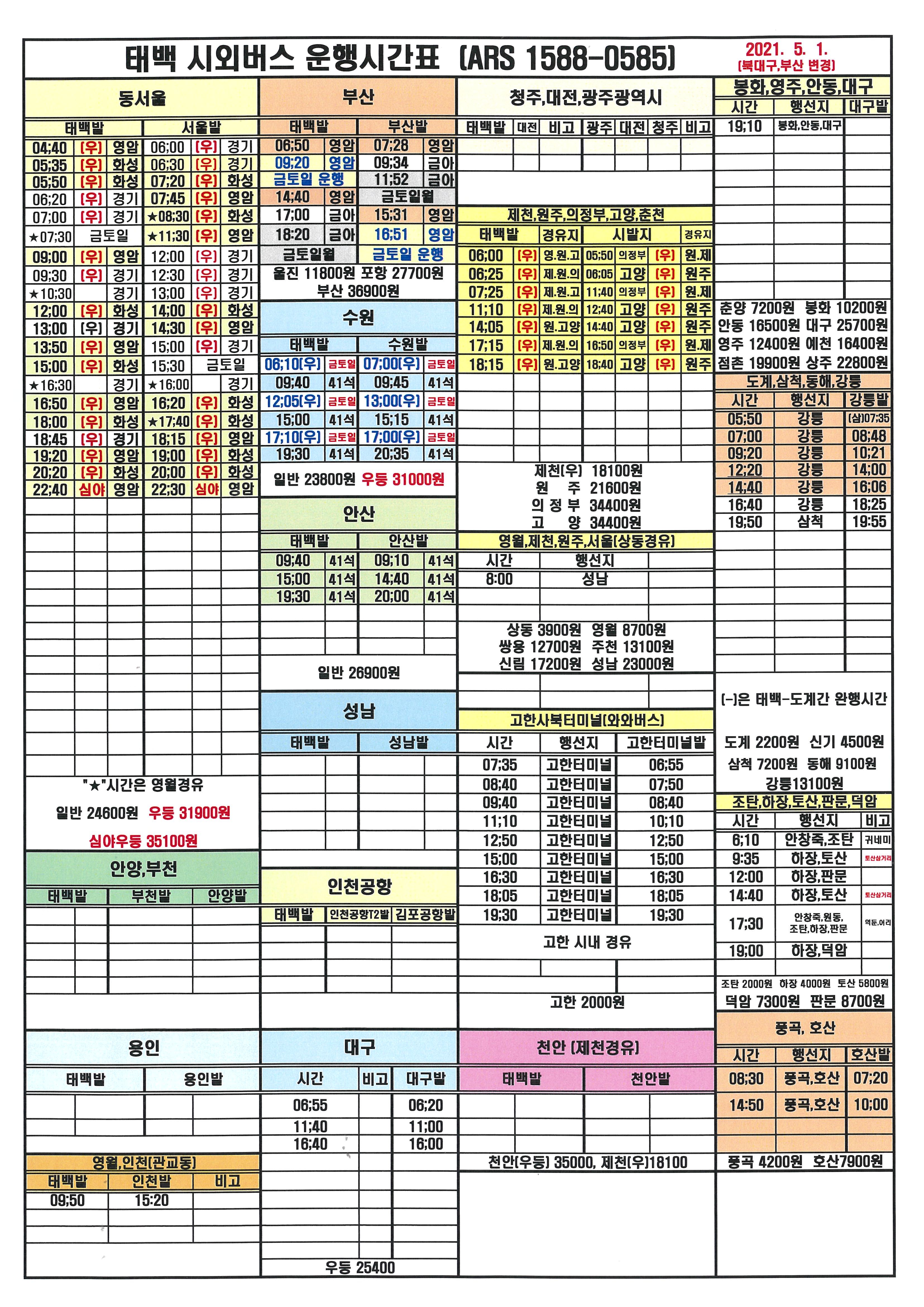 태백시외버스터미널 운행시간표 - 2021년 5월 1일 기준 시외버스 운행시간표