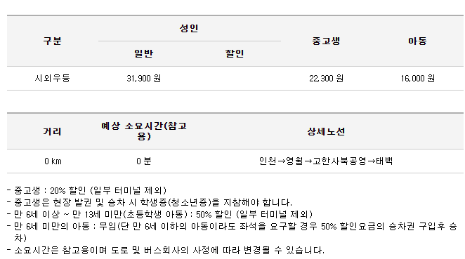 인천 -> 영월 -> 고한사북공영 -> 태백시외버스 터미널 순으로 정차를 한다.