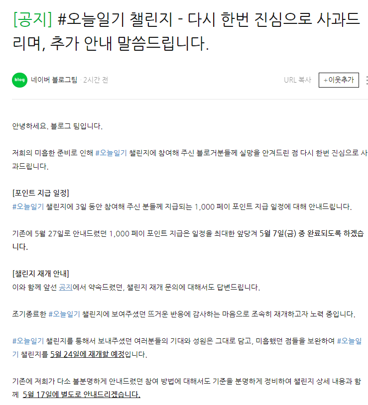 저희의 미흡한 준비로 인해 #오늘일기 챌린지에 참여해 주신 블로거분들께 실망을 안겨드린 점 다시 한번 진심으로 사과드립니다.