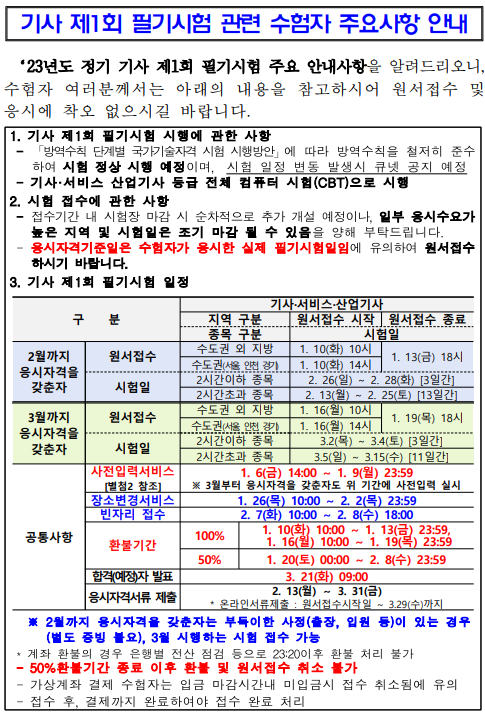 23년도 기사 제1회 필기 원서접수 관련 주요 안내사항을 붙임과 같이 알려드리오니,