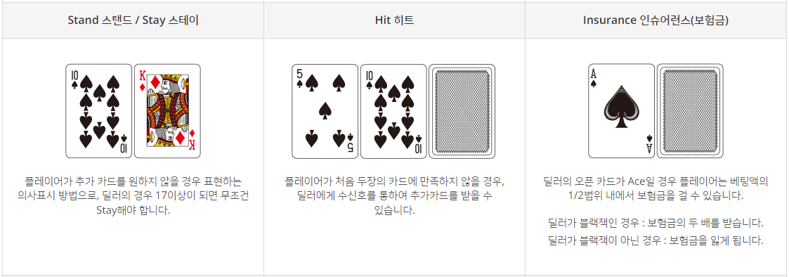 - 추가 카드를 원하면 Hit, 멈출 경우 Stay 수신호를 합니다.