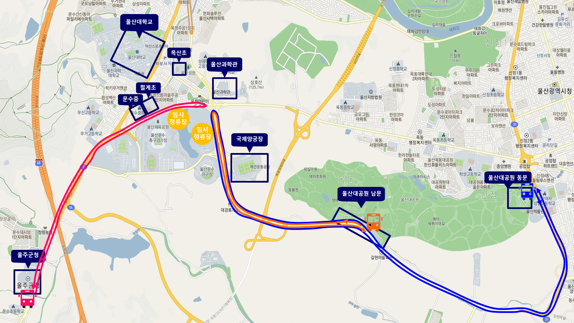 ○ 울산대공원 남문, 동문주차장 ↔ 경기장 동측 임시정류장(도보 15분 거리)