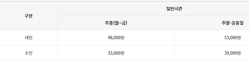 소인은 주중 3만3천원이며, 주말/공휴일은 3만9천원이다.
