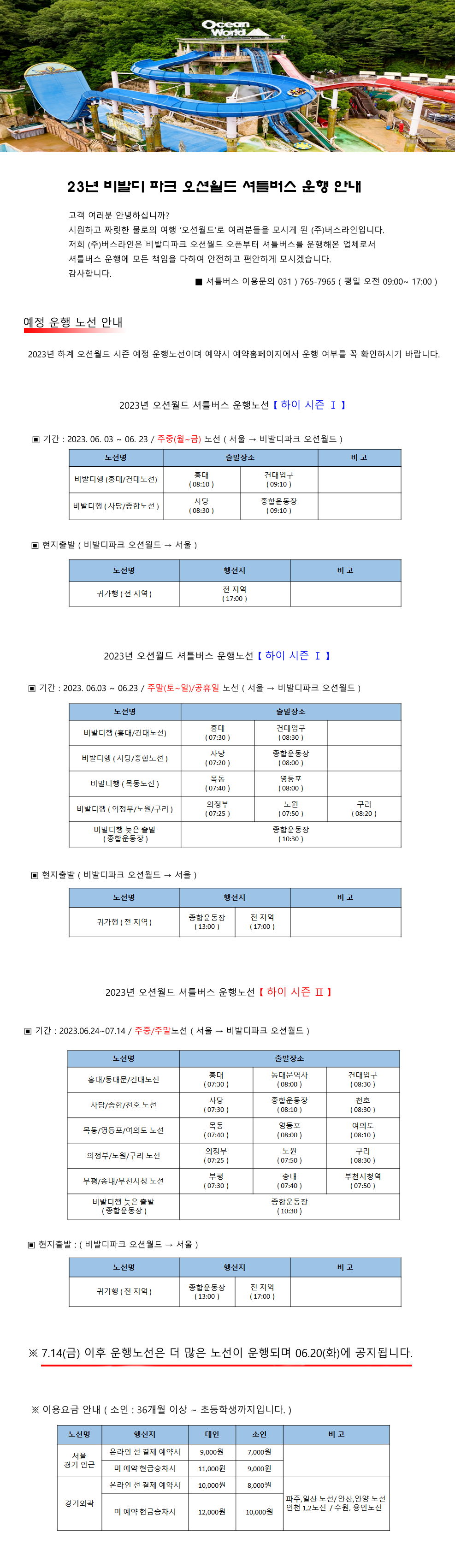 23년 하계 오션월드 운행 노선이며 예약시 예약홈페이지에서 운행 여부를 꼭 확인하시기 바랍니다.