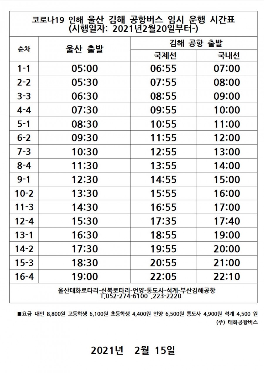 태화공항버스에서 제공하며 코로나19로 인하여 21년 2월 20일부터 적용되는 시간표이다.